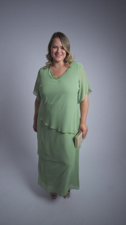Este vestido longo é sinônimo de elegância e sofisticação. O modelo conta com mangas delicadas, que trazem leveza e cobertura na medida certa. O decote em V valoriza o colo com um toque de feminilidade, enquanto o detalhe bordado acrescenta brilho e charme ao visual. A sobreposição de saia garante movimento e um acabamento fluido, ideal para ocasiões especiais como festas e casamentos
