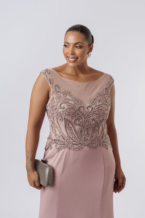 Vestido longo rosa de festa é a escolha perfeita para quem busca elegância e sofisticação. Com o corpo todo bordado no mesmo tom, o modelo ganha um toque de brilho com os detalhes em canutilho prata velha, criando um visual único e refinado. O decote canoa é realçado por uma leve transparência em tule, formando um detalhe delicado em V que valoriza o busto. A saia sereia, com sua abertura frontal, oferece um caimento impecável e um toque de ousadia, garantindo um look deslumbrante e cheio de glamour.