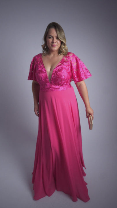 A elegância deste vestido longo de festa que é confeccionado em tule delicadamente bordado. O modelo apresenta mangas com transparência, adicionando um toque sofisticado e moderno. O decote valorizador traz amarração nas costas, garantindo um ajuste perfeito e um charme extra. A saia godê fluida completa o visual com movimento e leveza, tornando esta peça ideal para momentos especiais.