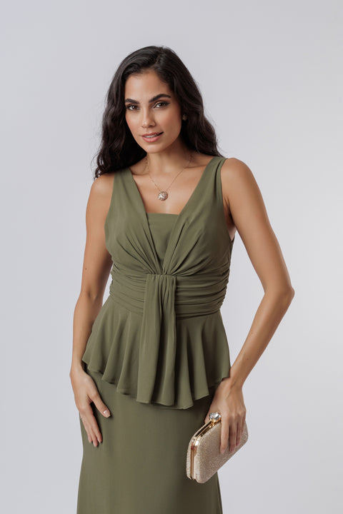 Sofisticado e moderno, este vestido de festa longo verde oliva é ideal para quem busca elegância com personalidade.