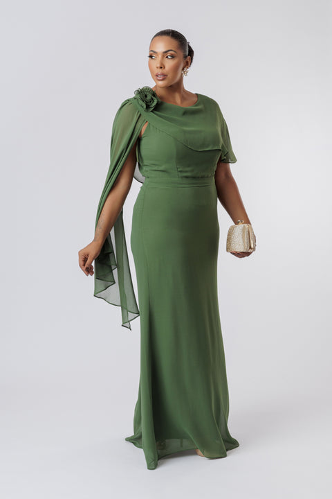 Sofisticado e elegante, este vestido longo de festa se destaca pela sobreposição de capa, que cobre um dos braços e forma uma manga fluida no lado oposto, criando um efeito moderno e refinado. Confeccionado em muceline, o modelo traz uma delicada flor no mesmo tecido, adicionando um toque romântico. A faixa na cintura valoriza a silhueta, enquanto a modelagem sereia realça as curvas com elegância.