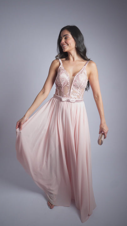 A sofisticação deste vestido longo em tule bordado, que combina transparência elegante na frente e nas costas para um toque refinado. O bojo estruturado e as alças finas garantem conforto e sustentação, enquanto a faixa de cetim com laço Chanel destaca a cintura com delicadeza. A saia amplamente evasê proporciona movimento e leveza, criando um visual romântico e sofisticado para ocasiões especiais.
