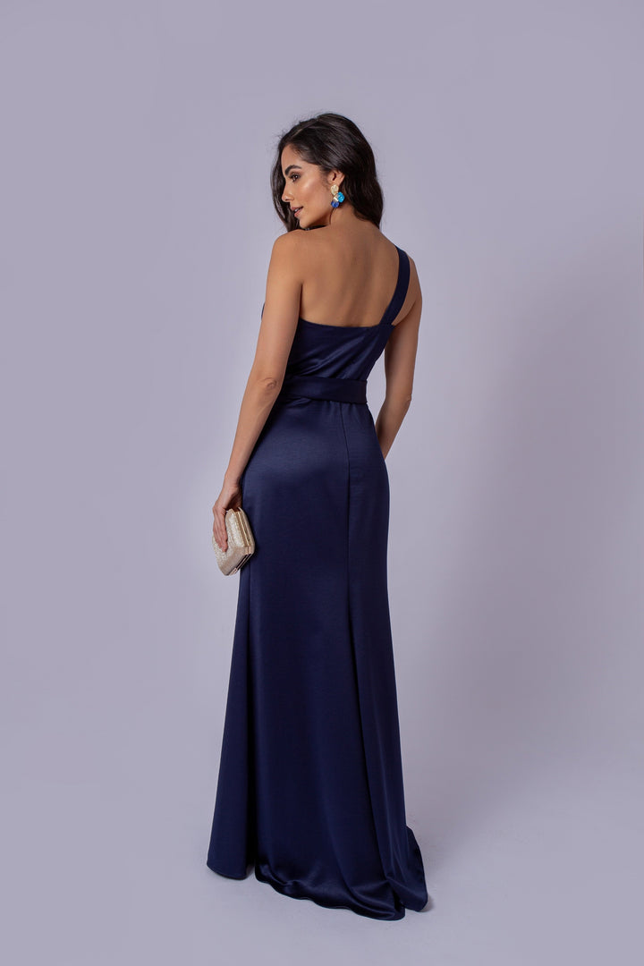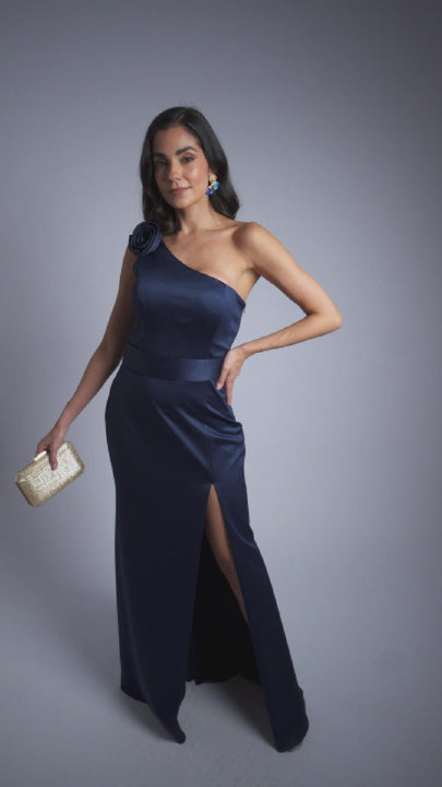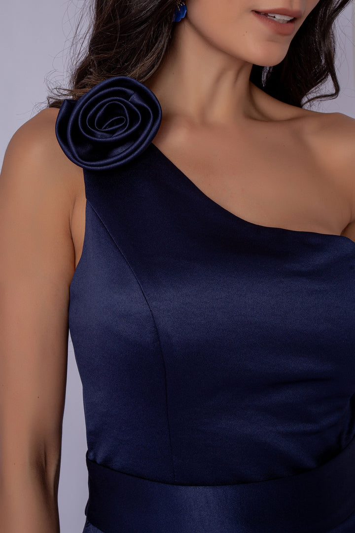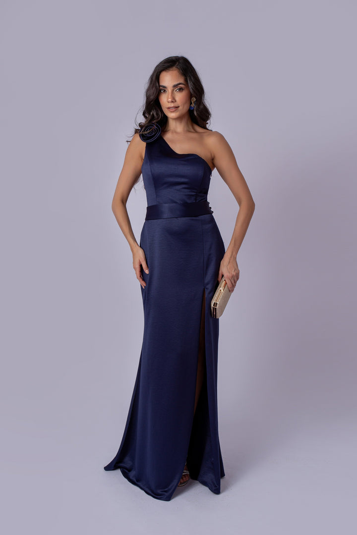 Este vestido de um ombro só é a escolha perfeita para quem busca elegância e estilo. O detalhe de flor, que pode ser colocado onde preferir, adiciona um toque de personalização ao look. A faixa na cintura define a silhueta, enquanto a abertura na saia confere movimento e leveza. Ideal para eventos especiais, oferece sofisticação com um toque único de charme.
