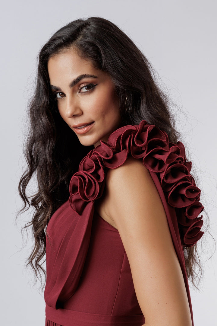✔ Tomara que caia com detalhe de alça pregueada e flores aplicadas