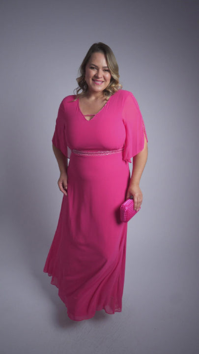 Vestido longo de festa elegante, com delicado bordado no decote V, mangas com abertura e detalhes refinados na cintura. A saia evasê fluida garante sofisticação e movimento, ideal para ocasiões especiais.